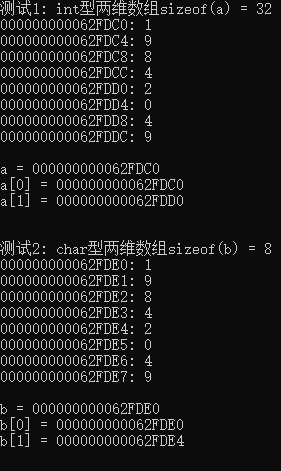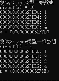 ③对于二维数组,a[0]和a[1]的值相差16个内存字节单元,b[0]和b[1]的值相差4个内存字节单元,相当于一行元素所占用的内存字节单元。