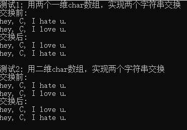 #include <stdio.h> #include <string.h> #define N 80 void swap_str(char s1[N], char s2[N]); void test1(); void test2(); int main() { printf("测试1: 用两个一维char数组,实现两个字符串交换\n"); test1(); printf("\n测试2: 用二维char数组,实现两个字符串交换\n"); test2(); return 0; } void test1() { char views1[N] = "hey, C, I hate u."; char views2[N] = "hey, C, I love u."; printf("交换前: \n"); puts(views1); puts(views2); swap_str(views1, views2); printf("交换后: \n"); puts(views1); puts(views2); } void test2() { char views[2][N] = {"hey, C, I hate u.", "hey, C, I love u."}; printf("交换前: \n"); puts(views[0]); puts(views[1]); swap_str(views[0], views[1]); printf("交换后: \n"); puts(views[0]); puts(views[1]); } void swap_str(char s1[N], char s2[N]) { char tmp[N]; strcpy(tmp, s1); strcpy(s1, s2); strcpy(s2, tmp); }