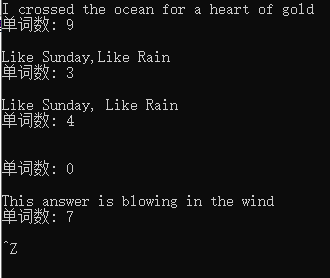 /* 从键盘输入一行英文文本,统计英文单词总数 为了简化问题处理,只考虑单词以空格间隔的情形 对教材例5.22代码做了些微改动: 1. 统计单词个数,编写成函数模块;增加了多组输入 2. 去掉了不必要的中间变量 */ #include <stdio.h> #define N 80 int count(char x[]); int main() { char words[N+1]; int n; while(gets(words) != NULL) { n = count(words); printf("单词数: %d\n\n", n); } return 0; } int count(char x[]) { int i; int word_flag = 0; // 用作单词标志,一个新单词开始,值为1;单词结束,值为0 int number = 0; // 统计单词个数 for(i = 0; x[i] != '\0'; i++) { if(x[i] == ' ') word_flag = 0; else if(word_flag == 0) { word_flag = 1; number++; } } return number; }