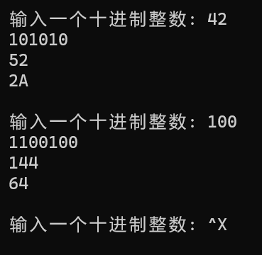 #include <stdio.h> #define N 100 void dec_to_n(int x, int n); // 函数声明 int main() { int x; printf("输入一个十进制整数: "); while(scanf("%d", &x) != EOF) { dec_to_n(x, 2); // 函数调用: 把x转换成二进制输出 dec_to_n(x, 8); // 函数调用: 把x转换成八进制输出 dec_to_n(x, 16); // 函数调用: 把x转换成十六进制输出 printf("\n输入一个十进制整数: "); } return 0; } // 函数定义 // 功能: 把十进制数x转换成n进制,打印输出 // 补足函数实现 // ××× void dec_to_n(int x,int n){ char map[17]={"0123456789ABCDEF"},ans[N];//通过数组map[]实现二、八、十六进制的统一转化 int i,count=0,t; do{ t=x%n;//取余得到的数即为数组map中相应下标对应的数 ans[count++]=map[t]; x=x/n; }while(x>0); for(i=count-1;i>=0;i--)//反向输出 { printf("%c",ans[i]); } printf("\n"); }