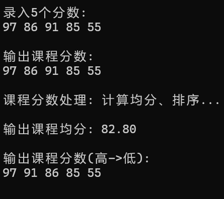#include <stdio.h> #define N 5 // 函数声明 void input(int x[], int n); void output(int x[], int n); double average(int x[], int n); void bubble_sort(int x[], int n); int main() { int scores[N]; double ave; printf("录入%d个分数:\n", N); input(scores, N); printf("\n输出课程分数: \n"); output(scores, N); printf("\n课程分数处理: 计算均分、排序...\n"); ave = average(scores, N); bubble_sort(scores, N); printf("\n输出课程均分: %.2f\n", ave); printf("\n输出课程分数(高->低):\n"); output(scores, N); return 0; } // 函数定义 // 输入n个整数保存到整型数组x中 void input(int x[], int n) { int i; for(i = 0; i < n; ++i) scanf("%d", &x[i]); } // 输出整型数组x中n个元素 void output(int x[], int n) { int i; for(i = 0; i < n; ++i) printf("%d ", x[i]); printf("\n"); } // 计算整型数组x中n个元素均值,并返回 // 补足函数average()实现 // ××× double average(int x[], int n){ int i; double ave=0.0; for(i=0;i<n;i++){ ave+=x[i]; } ave/=n; return ave; } // 对整型数组x中的n个元素降序排序 // 补足函数bubble_sort()实现 // ××× void bubble_sort(int x[], int n){ int i,j,t; int m=1; for(i=0;i<n-1;i++){ m=0; for(j=0;j<n-1-i;j++) if(x[j]<x[j+1]) { m=1; t=x[j]; x[j]=x[j+1]; x[j+1]=t; } if(m=0) break; } }