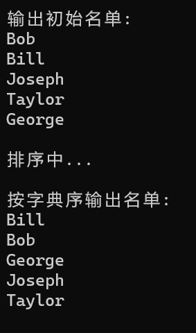 #include <stdio.h> #include <string.h> #define N 5 #define M 20 // 函数声明 void output(char str[][M], int n); void bubble_sort(char str[][M], int n); int main() { char name[][M] = {"Bob", "Bill", "Joseph", "Taylor", "George"}; int i; printf("输出初始名单:\n"); output(name, N); printf("\n排序中...\n"); bubble_sort(name, N); // 函数调用 printf("\n按字典序输出名单:\n"); output(name, N); return 0; } // 函数定义 // 功能:按行输出二维数组中的字符串 void output(char str[][M], int n) { int i; for(i = 0; i < n; ++i) printf("%s\n", str[i]); } // 函数定义 // 功能:使用冒泡排序算法对二维数组str中的n个字符串按字典序排序 // 补足函数bubble_sort()实现 // ××× void bubble_sort(char str[][M], int n){ int i,j; char temp[M]; for(i=0;i<n-1;i++){ for(j=0;j<n-1-i;j++){ if(strcmp(str[j],str[j+1])>0) { strcpy(temp,str[j]); strcpy(str[j],str[j+1]); strcpy(str[j+1],temp); } } } }