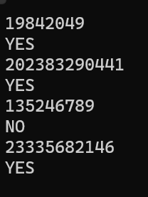 #include<stdio.h> #include<string.h> #define N 100 int main(){ char x[N]; while(gets(x)!=NULL) { int i,j,t=0,m=0; int count[10]={0}; char y[11]={"0123456789"}; t=strlen(x); for(i=0;i<t;i++) for(j=0;j<10;j++) if(x[i]==y[j]) { count[j]++; } for(i=0;i<10;i++) { if(count[i]>=2) m++; } if(m!=0) printf("YES\n"); else printf("NO\n"); } return 0; }
