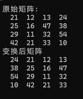 #include <stdio.h> #define N 100 #define M 4 void output(int x[][N], int n); //函数声明 void rotate_to_right(int x[][N], int n);//函数声明 int main() { int t[][N] = {{21, 12, 13, 24}, {25, 16, 47, 38}, {29, 11, 32, 54}, {42, 21, 33, 10}}; printf("原始矩阵:\n"); output(t, M); // 函数调用 rotate_to_right(t, M); // 函数调用 printf("变换后矩阵\n"); output(t, M); // 函数调用 return 0; } // 函数调用 // 功能:输出一个n*n的矩阵x void output(int x[][N], int n) { int i, j; for (i = 0; i < n; ++i) { for (j = 0; j < n; ++j) printf("%4d", x[i][j]); printf("\n"); } } //待补足3:函数rotate_to_right()定义 // 功能:把一个n*n的矩阵x,每一列向右移,最右边被移出去的一列 绕回左边 // xxx void rotate_to_right(int x[][N], int n){ int i,j,t; for(i=0;i<n;i++) { t=x[i][n-1]; for(j=n-1;j>0;j--) { x[i][j]=x[i][j-1]; } x[i][0]=t; } }