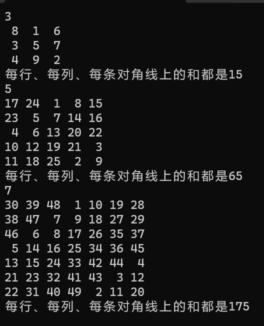 #include<stdio.h> int main(){ int n; while(scanf("%d",&n)!=EOF){ int array[n][n]; // 声明一个n阶二维数组 int i, j, k,sum; // 二维数组赋初值都为0 for(i = 0; i < n; i++){ for(j = 0; j < n; j++){ array[i][j] = 0; } } // 找到1存放的位置 i=0; j=n/2; array[i][j] = 1; // 从2 ~ n*n一次添加到矩阵中 for(k = 2; k <= n*n; k++) { i = i - 1; // 行减1 j = j + 1; // 列加1 if((i < 0) && (j == n)){ // 如果上一个元素为第一行第n列,则放在上一个元素的下面 i = i + 2; j = j - 1; } else{ if(i < 0) i = n - 1; // 如果上一个元素是第一行,则下个元素在最后一行 if(j == n) j = 0; // 如果上一个元素是第一列,则下个元素在第一列 } if(array[i][j] == 0){ // 如果二维数组array[i][j]的位置未被占用,则把k赋值到 array[i][j] array[i][j] = k; } else{ // 如果二维数组array[i][j]位置已经被占用,则把k放在上一个位置的下面 i = i + 2; j = j -1; array[i][j] = k; } } // 打印魔方阵 for(i = 0; i < n; i++){ sum=0; for(j = 0; j < n; j++){ printf("%2d ", array[i][j]); sum+=array[i][j]; } printf("\n"); } printf("每行、每列、每条对角线上的和都是%d\n",sum); } return 0; }