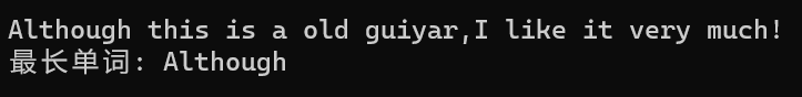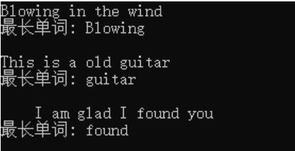 /* 输入一行英文文本,统计最长单词,并打印输出。 为简化问题,只考虑单词之间用空格间隔的情形。 相较于教材例5.24,做了以下改动: 1. 增加了多组输入,因此,一些变量初始化放到了第一层循环里面 2. 微调了代码书写逻辑和顺序 */ #include <stdio.h> #define N 1000 int main() { char line[N]; int word_len; // 记录当前单词长度 int max_len; // 记录最长单词长度 int end; // 记录最长单词结束位置 int i; while(gets(line) != NULL) { word_len = 0; max_len = 0; end = 0; i = 0; while(1) { // 跳过连续空格 while(line[i]<65||(line[i]>90&&line[i]<97)||line[i]>122||line[i]==' ') { word_len = 0; // 单词长度置0,为新单词统计做准备 i++; } // 在一个单词中,统计当前单词长度 while((line[i]>=65&&line[i]<=90)||(line[i]>=97&&line[i]<=122)) { word_len++; i++; } // 更新更长单词长度,并,记录最长单词结束位置 if(max_len < word_len) { max_len = word_len; end = i; // end保存的是单词结束的下一个坐标位置 } // 遍历到文本结束时,终止循环 if(line[i] == '\0') break; } // 输出最长单词 printf("最长单词: "); for(i = end - max_len; i < end; ++i) printf("%c", line[i]); printf("\n\n"); } return 0; }