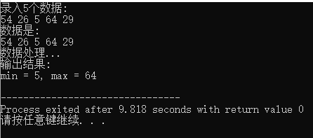 1 #include <stdio.h> 2 #define N 5 3 4 void input(int x[], int n); 5 void output(int x[], int n); 6 void find_min_max(int x[], int n, int *pmin, int *pmax); 7 8 int main() { 9 int a[N]; 10 int min, max; 11 12 printf("录入%d个数据:\n", N); 13 input(a, N); 14 15 printf("数据是: \n"); 16 output(a, N); 17 18 printf("数据处理...\n"); 19 find_min_max(a, N, &min, &max); 20 21 printf("输出结果:\n"); 22 printf("min = %d, max = %d\n", min, max); 23 24 return 0; 25 } 26 27 void input(int x[], int n) { 28 int i; 29 30 for(i = 0; i < n; ++i) 31 scanf("%d", &x[i]); 32 } 33 34 void output(int x[], int n) { 35 int i; 36 37 for(i = 0; i < n; ++i) 38 printf("%d ", x[i]); 39 printf("\n"); 40 } 41 42 void find_min_max(int x[], int n, int *pmin, int *pmax) { 43 int i; 44 45 *pmin = *pmax = x[0]; 46 47 for(i = 1; i < n; ++i) 48 if(x[i] < *pmin) 49 *pmin = x[i]; 50 else if(x[i] > *pmax) 51 *pmax = x[i]; 52 }