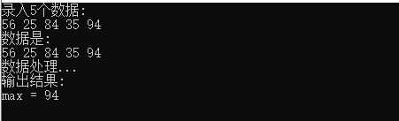 1 #include <stdio.h> 2 #define N 5 3 4 void input(int x[], int n); 5 void output(int x[], int n); 6 int *find_max(int x[], int n); 7 8 int main() { 9 int a[N]; 10 int *pmax; 11 12 printf("录入%d个数据:\n", N); 13 input(a, N); 14 15 printf("数据是: \n"); 16 output(a, N); 17 18 printf("数据处理...\n"); 19 pmax = find_max(a, N); 20 21 printf("输出结果:\n"); 22 printf("max = %d\n", *pmax); 23 24 return 0; 25 } 26 27 void input(int x[], int n) { 28 int i; 29 30 for(i = 0; i < n; ++i) 31 scanf("%d", &x[i]); 32 } 33 34 void output(int x[], int n) { 35 int i; 36 37 for(i = 0; i < n; ++i) 38 printf("%d ", x[i]); 39 printf("\n"); 40 } 41 42 int *find_max(int x[], int n) { 43 int max_index = 0; 44 int i; 45 46 for(i = 1; i < n; ++i) 47 if(x[i] > x[max_index]) 48 max_index = i;//找出最大值所在下标 49 50 return &x[max_index];//返回值必须是地址 51 }