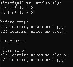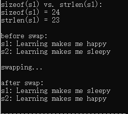 1 #include <stdio.h> 2 #include <string.h> 3 #define N 80 4 5 int main() { 6 char s1[] = "Learning makes me happy"; 7 char s2[] = "Learning makes me sleepy"; 8 char tmp[N]; 9 10 printf("sizeof(s1) vs. strlen(s1): \n"); 11 printf("sizeof(s1) = %d\n", sizeof(s1)); 12 printf("strlen(s1) = %d\n", strlen(s1)); 13 14 printf("\nbefore swap: \n"); 15 printf("s1: %s\n", s1); 16 printf("s2: %s\n", s2); 17 18 printf("\nswapping...\n"); 19 strcpy(tmp, s1); 20 strcpy(s1, s2); 21 strcpy(s2, tmp); 22 23 printf("\nafter swap: \n"); 24 printf("s1: %s\n", s1); 25 printf("s2: %s\n", s2); 26 27 return 0; 28 }