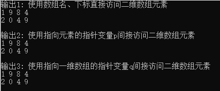 1 #include <stdio.h> 2 3 #include <stdio.h> 4 5 int main() { 6 int x[2][4] = {{1, 9, 8, 4}, {2, 0, 4, 9}}; 7 int i, j; 8 int *ptr1; // 指针变量,存放int类型数据的地址 9 int(*ptr2)[4]; // 指针变量,指向包含4个int元素的一维数组 10 11 printf("输出1: 使用数组名、下标直接访问二维数组元素\n"); 12 for (i = 0; i < 2; ++i) { 13 for (j = 0; j < 4; ++j) 14 printf("%d ", x[i][j]); 15 printf("\n"); 16 } 17 18 printf("\n输出2: 使用指向元素的指针变量p间接访问二维数组元素\n"); 19 for (ptr1 = &x[0][0], i = 0; ptr1 < &x[0][0] + 8; ++ptr1, ++i) { 20 printf("%d ", *ptr1); 21 22 if ((i + 1) % 4 == 0) 23 printf("\n"); 24 } 25 26 printf("\n输出3: 使用指向一维数组的指针变量q间接访问二维数组元素\n"); 27 for (ptr2 = x; ptr2 < x + 2; ++ptr2) { 28 for (j = 0; j < 4; ++j) 29 printf("%d ", *(*ptr2 + j)); 30 printf("\n"); 31 } 32 33 return 0; 34 }