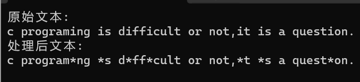1 #include<stdio.h> 2 #define N 80 3 4 void replace(char *str,char old_char,char new_char);//函数声明 5 6 int main(){ 7 char text[N]="c programing is difficult or not,it is a question."; 8 9 printf("原始文本:\n"); 10 printf("%s\n",text); 11 12 replace(text,'i','*');//函数调用 注意字符形参写法,单引号不能少 13 14 printf("处理后文本:\n"); 15 printf("%s\n",text); 16 17 return 0; 18 } 19 20 //函数定义 21 void replace(char *str,char old_char,char new_char){ 22 int i; 23 24 while(*str){ 25 if(*str==old_char) 26 *str=new_char; 27 str++; 28 } 29 }