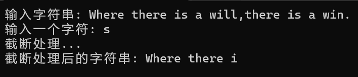 #include<stdio.h> #define N 80 void str_trunc(char *str, char x); int main() { char str[N]; char ch; printf("输入字符串: "); gets(str); printf("输入一个字符: "); ch = getchar(); printf("截断处理...\n"); str_trunc(str, ch); printf("截断处理后的字符串: %s\n", str); } void str_trunc(char *str, char x) { while(*str) { if(*str == x) ++*str='\0'; str++; } }