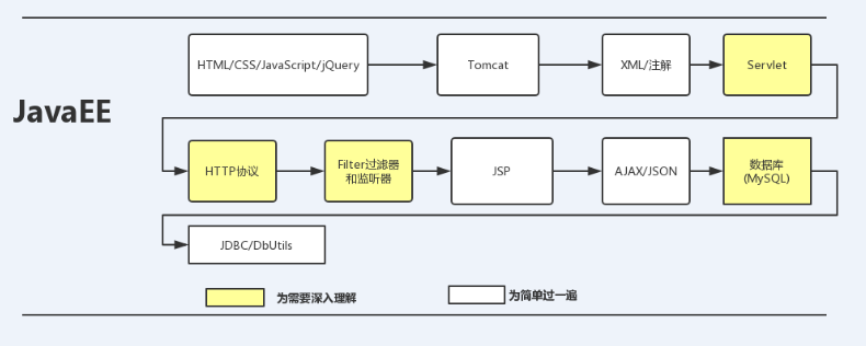 JavaWeb基础-->HTML/CSS/JavaScript/jQuery-->Tomcat-->XML/注解->Servlet-->HTTP-->Filter过滤器和监听器-->JSP-->AJAX/JSON-->数据库(MySQL)-->JDBC和DbUtils