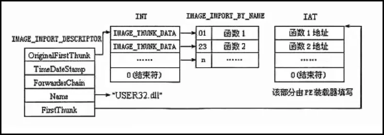 1 struct _IMAGE_IMPORT_DESCRIPTOR 2 { 3 0x00 union 4 { 5 0x00 DWORD Characteristics; 6 0x00 PIMAGE_THUNK_DATA OriginalFirstThunk; //RVA:INT(导入名称表) 7 } u; 8 0x04 DWORD TimeDateStamp; 9 0x08 DWORD ForwarderChain; 10 0x0c DWORD Name; //RVA:DLL 名称 11 0x10 PIMAGE_THUNK_DATA FirstThunk; //RVA:IAT(导入地址表) 12 };