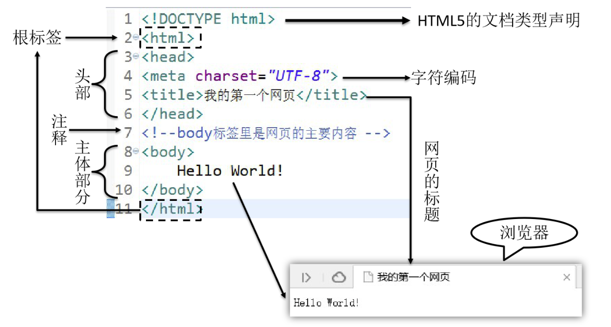 文档声明: HTML文件中第一行的内容,用来告诉浏览器当前HTML文档的基本信息,其中最重要的就是当前HTML文档遵循的语法标准。这里我们只需要知道HTML有4和5这两个大的版本,HTML4版本的文档类型声明是: