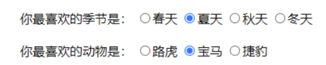 你最喜欢的季节是: <input type="radio" name="season" value="spring" />春天 <input type="radio" name="season" value="summer" checked="checked" />夏天 <input type="radio" name="season" value="autumn" />秋天 <input type="radio" name="season" value="winter" />冬天 <br/><br/> 你最喜欢的动物是: <input type="radio" name="animal" value="tiger" />路虎 <input type="radio" name="animal" value="horse" checked="checked" />宝马 <input type="radio" name="animal" value="cheetah" />捷豹