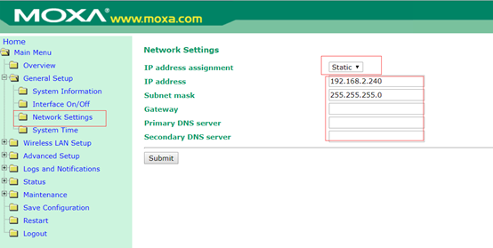 第一栏下拉菜单中选择Static,即手动配置AWK 的IP 地址。