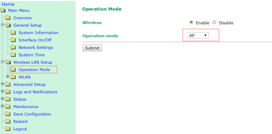 配置完工作模式后, 点击submit 提交。如果不需要配置其他功能, 选择save and restart,