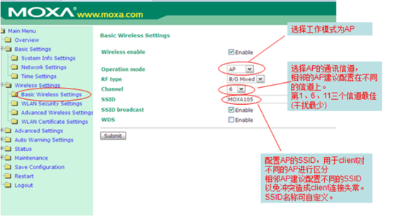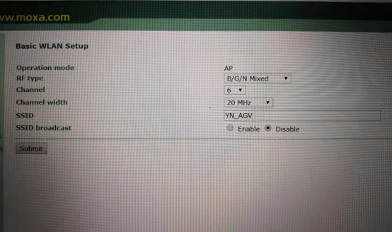 可以自定义(例如MOXA TEST 等) ,启用SSID broadcast,不要启用WDS 功能。