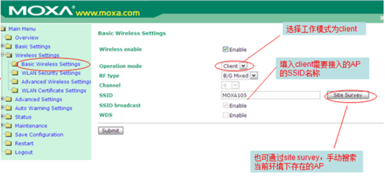 2、对于AP Client 客户端站点: operation mode 选择AP Client ,SSID 与AP 的设置一致。