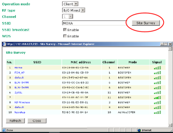 点击site survey 后弹出搜索页面,显示所有在线AP 的列表,