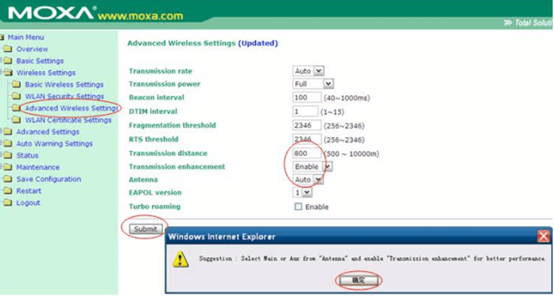 1、将Transmission enhancement 一项设置为Enable,启用AWK 设备的无线功率增强功能,以达