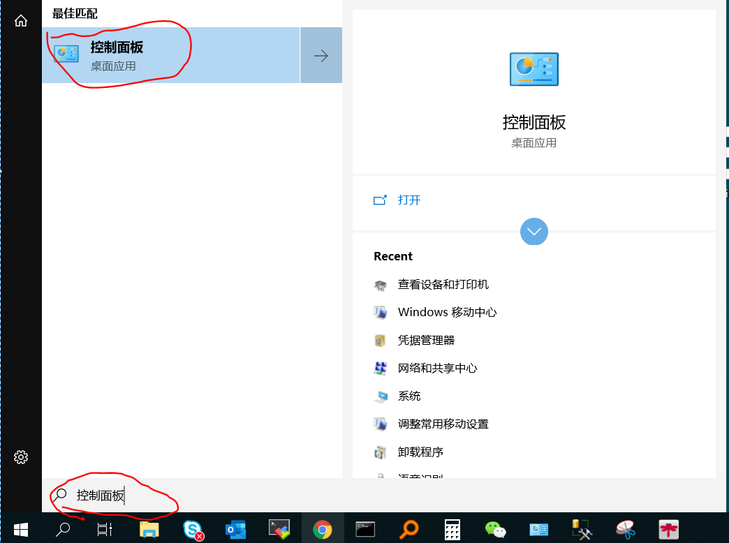 1、在系统右下角的搜索中输入“控制面板”并打开。
