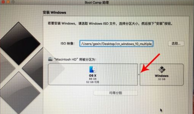 5、接着是分区,分出来一个区给windows系统,用鼠标拖动中间小圆点划分两个分区的大小,一般需要30G以上,具体看你的硬盘大小,分区之后,点击安装;