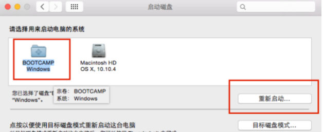 2、进入OS X系统后,在“系统偏好设置”里找到“启动磁盘”,选择“Macintosh HD OS X”或者“Windows”,点击“重新启动”按钮,就可以设置下次启动后默认进入的系统了。