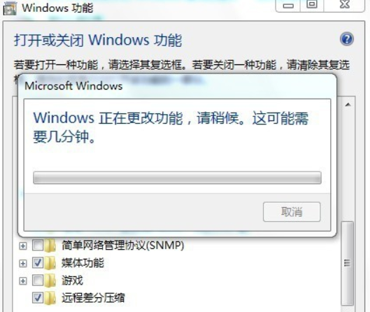 4、这是弹出一个对话框“Windows正在更改功能,请稍候。这可能需要几分钟。”你只需要耐心等待一下就好了