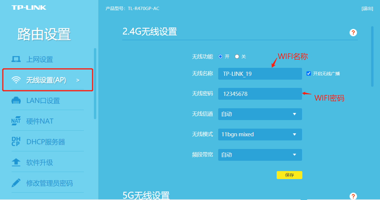 无线设置(AP),设置无线名称和密码,可同时设置2.4G和5G,2.4G和5G的无线名称和密码可以不相同,单独设置。在无线AP面板在FIT模式下,无线AP面板会同步此无线设置。