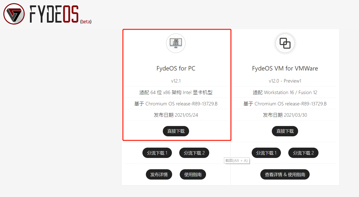 进入Fydes系统官网下载系统镜像:https://fydeos.com/download,注意Fydes系统只能安装在Inter硬件平台,支持集成Inter显卡。