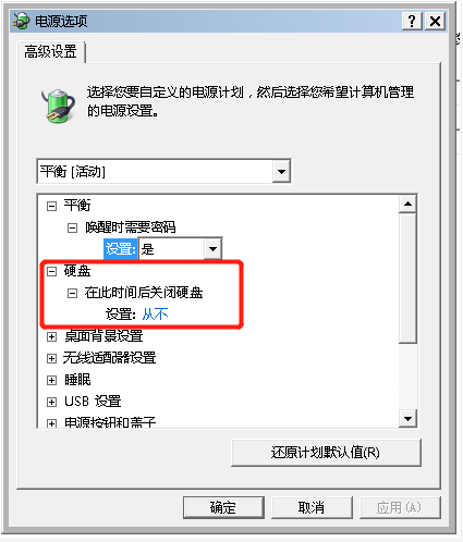 1、更改计算机电源设置,在电源选项设置硬盘不要关闭