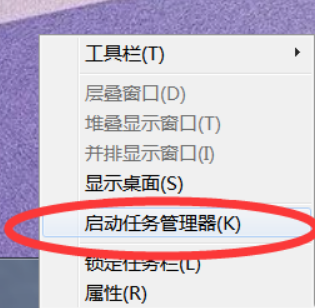 2、此时在桌面任务栏的空白处点击鼠标右键,在弹出的选项中点击“启动任务管理器”选项。