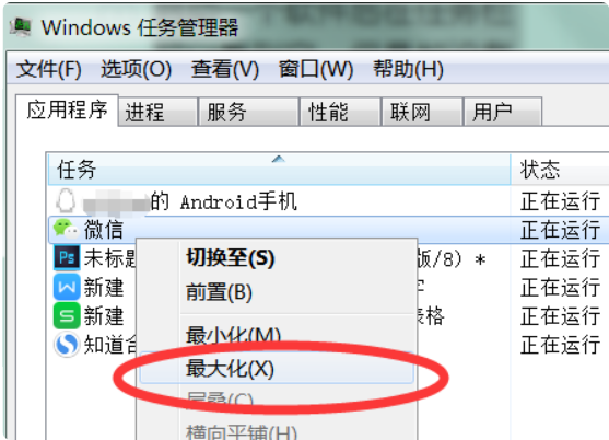 4、右键点击微信程序的位置,在弹出的选项中点击“最大化”选项。