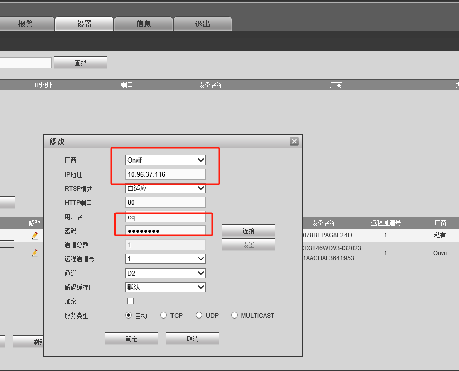 用户名和密码输入摄像头协议中创建的用名和密码