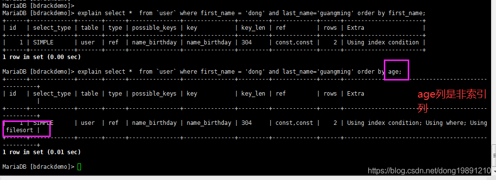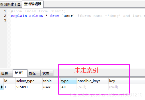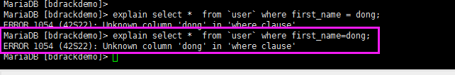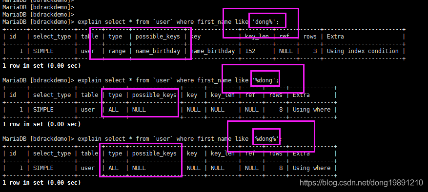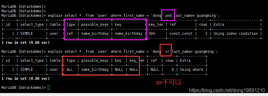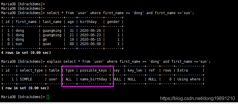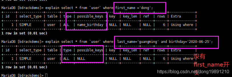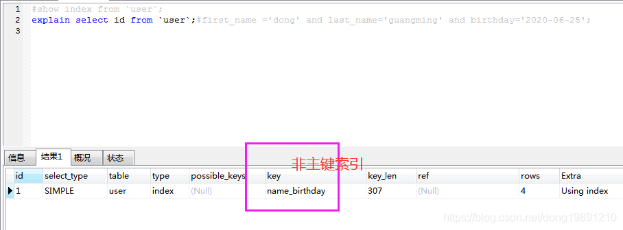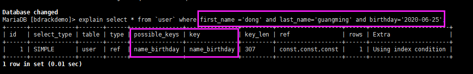 explain select * from `user` where first_name ='dong' and last_name='guangming' and birthday='2020-06-25';