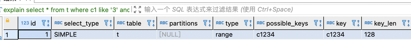explain select * from t where c1 like '3' and c2 = '1' and c3 = '1' and c4 = '1';