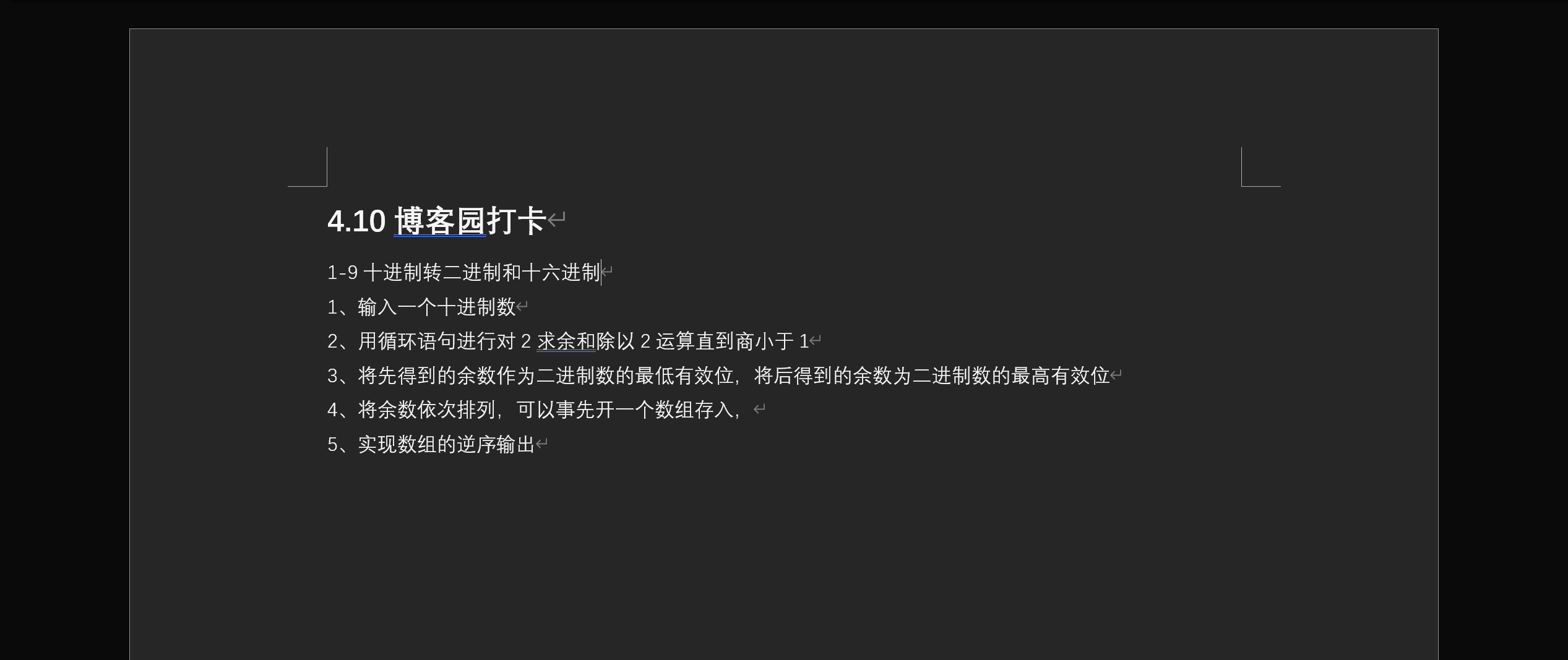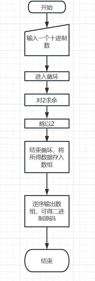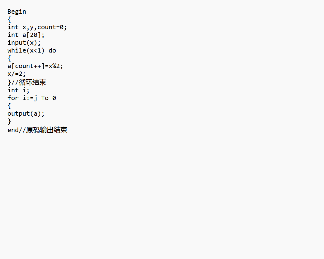 1 #include <stdio.h> 2 int main() 3 { 4 int x,y,count=0; 5 int a[20]; 6 scanf("%d",&x); 7 while(x/2) 8 { 9 a[count++]=x%2; 10 x/=2; 11 }//循环结束 12 a[count++]=x%2; 13 int i; 14 for(i=count-1;i>=0;i--) 15 { 16 printf("%d",a[i]);//输出原码 17 } 18 return 0; 19 }