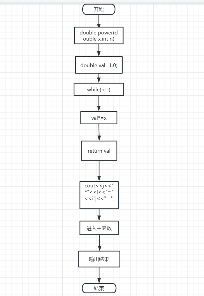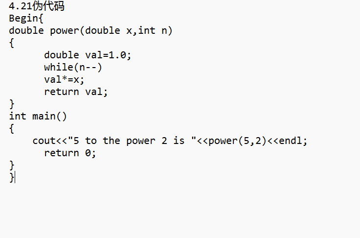 #include <iostream> #include <iomanip> #include <cmath> using namespace std; double power(double x,int n) { double val=1.0; while(n--) val*=x; return val; } int main() { cout<<"5 to the power 2 is "<<power(5,2)<<endl; return 0; }