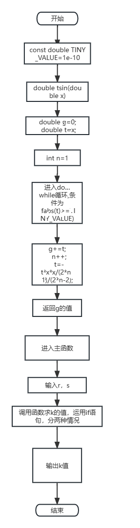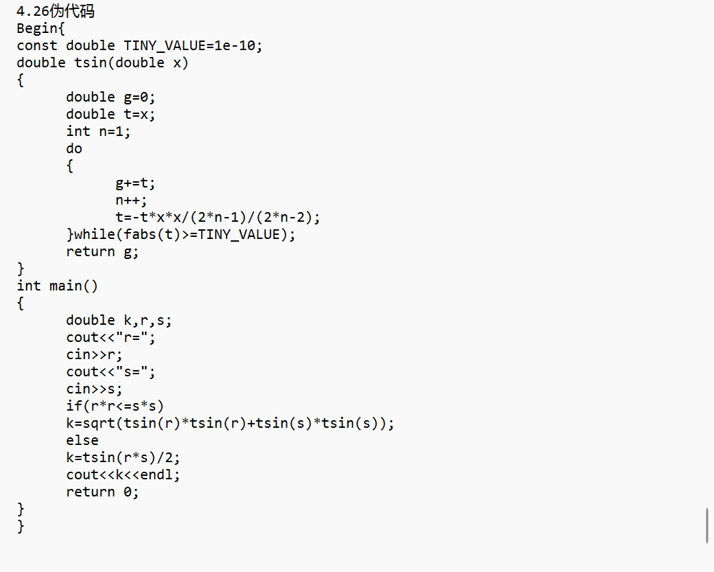 #include <iostream> #include <iomanip> #include <cmath> using namespace std; const double TINY_VALUE=1e-10; double tsin(double x) { double g=0; double t=x; int n=1; do { g+=t; n++; t=-t*x*x/(2*n-1)/(2*n-2); }while(fabs(t)>=TINY_VALUE); return g; } int main() { double k,r,s; cout<<"r="; cin>>r; cout<<"s="; cin>>s; if(r*r<=s*s) k=sqrt(tsin(r)*tsin(r)+tsin(s)*tsin(s)); else k=tsin(r*s)/2; cout<<k<<endl; return 0; }