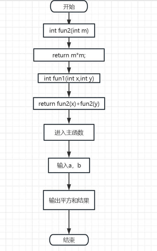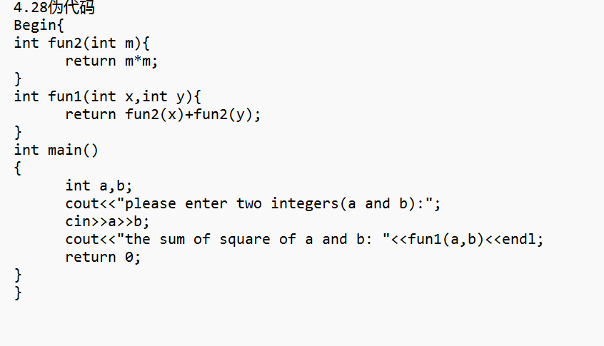 #include <iostream> #include <iomanip> #include <cmath> using namespace std; int fun2(int m){ return m*m; } int fun1(int x,int y){ return fun2(x)+fun2(y); } int main() { int a,b; cout<<"please enter two integers(a and b):"; cin>>a>>b; cout<<"the sum of square of a and b: "<<fun1(a,b)<<endl; return 0; }