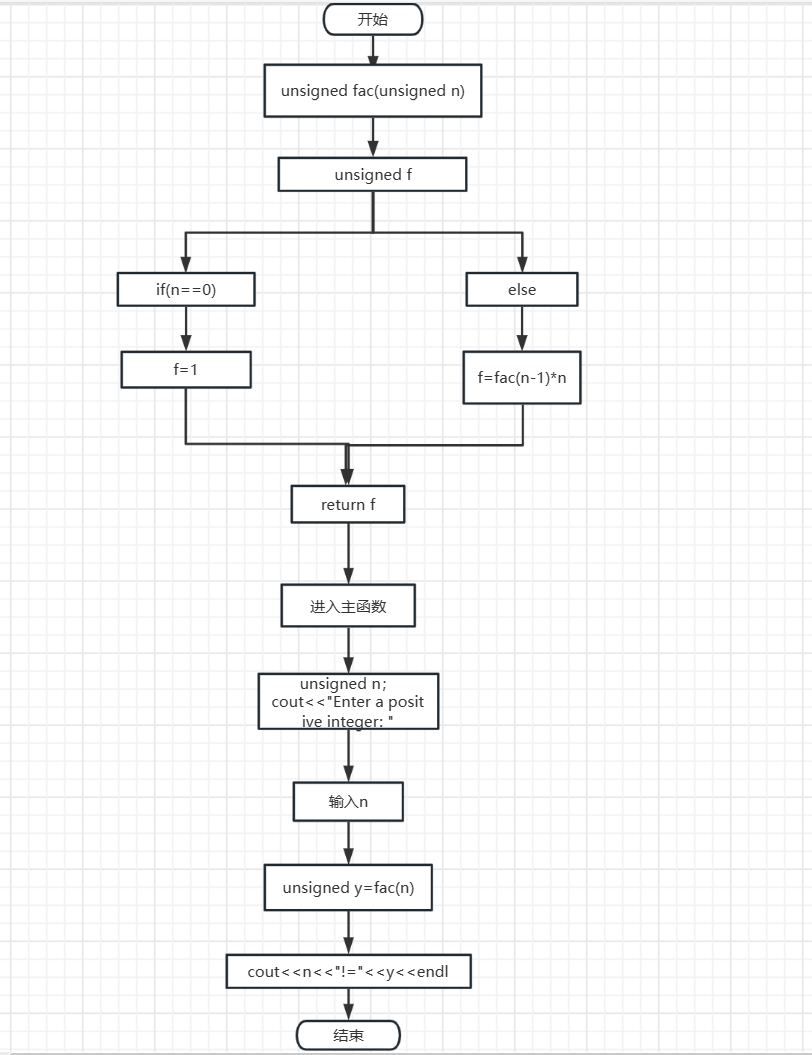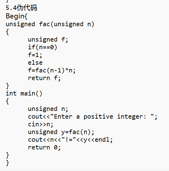 #include <bits/stdc++.h> using namespace std; unsigned fac(unsigned n) { unsigned f; if(n==0) f=1; else f=fac(n-1)*n; return f; } int main() { unsigned n; cout<<"Enter a positive integer: "; cin>>n; unsigned y=fac(n); cout<<n<<"!="<<y<<endl; return 0; }