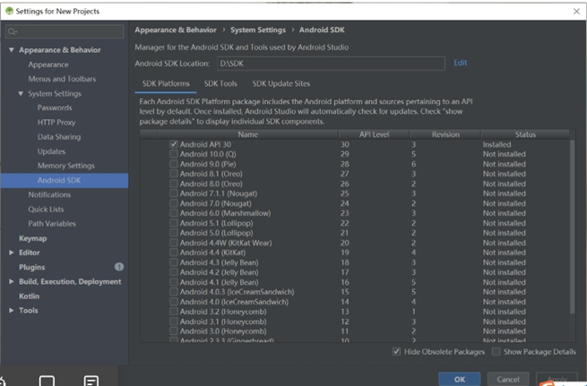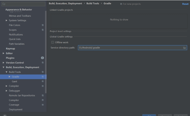 3、 再点击build下的gradle更改路径为D:Android/.gradle,点击OK。(我用梯子可以直接下载)