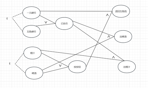 若投入5角钱的硬币,按下“橙汁”或“啤酒”的按钮,则相应的饮料就送出来。若投入1元钱的硬币,同样也是按“橙汁”或“啤酒”的按钮,则自动售货机在送出相应饮料的同时退回5角钱的硬币。