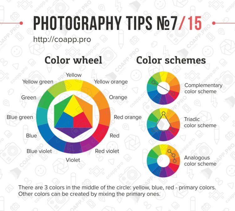 从红、黄、蓝三种原色中,可以混合成各种不同的颜色,形成十二色色环。掌握色环就可以理解摄影配色,例如处于色环对角线的互补色,和在色环中相邻的近似色。