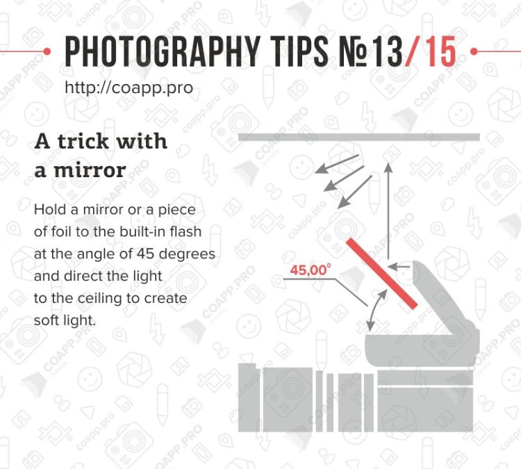 将一块镜或锡纸,放在相机的内置闪光灯前方成45°(如图),就可以将灯光反射到天花板,再反射到拍摄物件,形成更柔和的闪光。