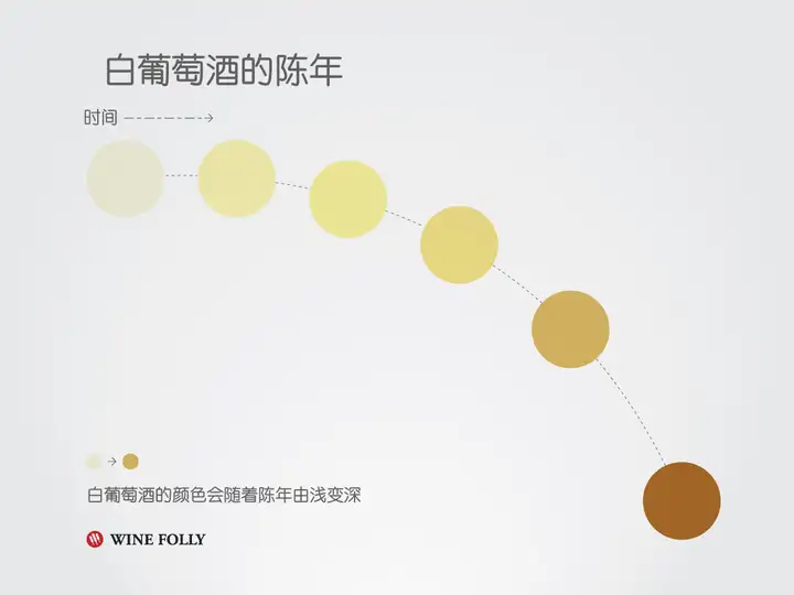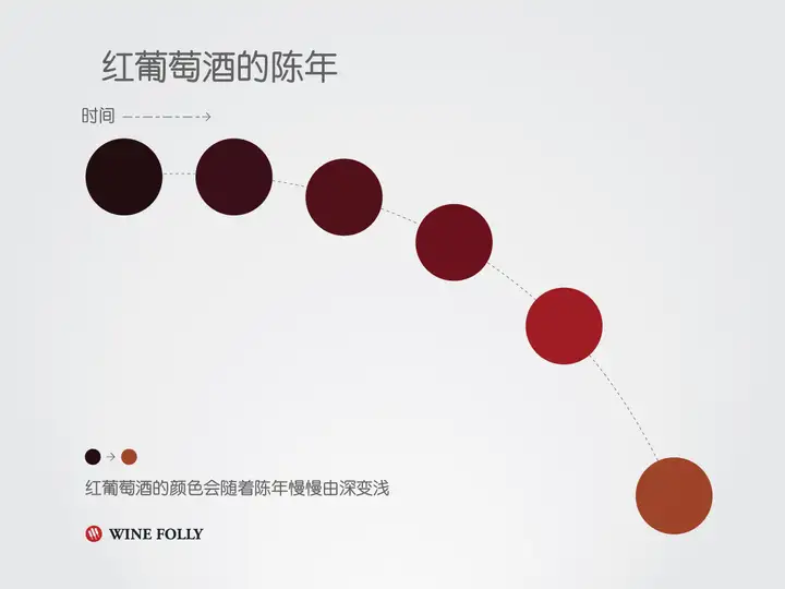 随着陈年,葡萄酒中的天然色素会慢慢发生变化,葡萄酒的颜色随之改变。红葡萄酒的色泽会慢慢由深变浅,颜色从原来的红色或者红紫色向砖红色发展,直到棕色。白葡萄酒的颜色随着陈年反而越来越深,颜色从黄绿色或者黄色慢慢也向棕色发展。