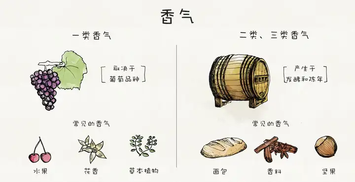 当葡萄酒年轻的时候,它的香气通常会以新鲜的果味为主,另外还可能会有花香或草本植物的香气,我们称这类香气为“一类香气”。比如红葡萄酒的草莓、樱桃、李子,或者白葡萄酒的柑橘、菠萝、柠檬。