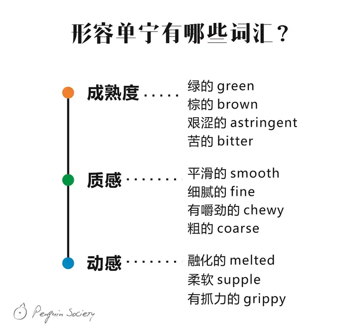 再进阶一些的时候,你可以去感受单宁的质感和粗细。可以参考的词汇包括:飘柔般顺滑、天鹅绒、有嚼劲儿chewy、fine-grained、grainy、crunchy、coarse、open-knit等